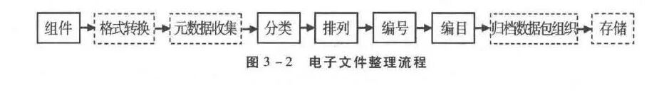 具体来说,纸质文件材料的整理流程包括:组件、修整、装订、分类、排列、编号、编页、编目、装盒、排架,如图3一1所示。与之相对应,电子文件的整理流程包括:组件、格式转换、元数据收集、分类、排列、编号、编目、归档数据包组织、存储等,如图3一2所示。